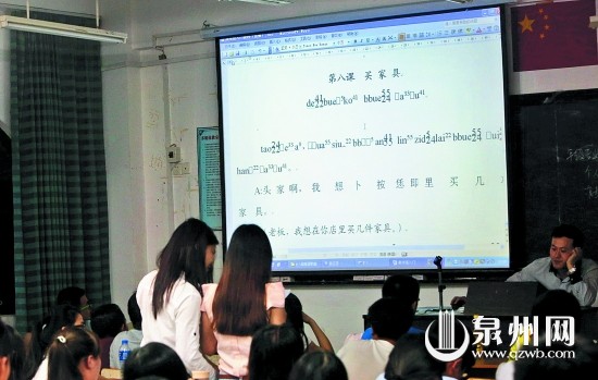 “让学生们有一点方言基础,更接近、了解闽南文化。”王建设教授说,开设这门课程的意义,是让本地学生了解泉州话怎么用文字表达,并普及泉州的一些常识、俗语;对外地学生来说,则让他们了解当地方言基础,倘若他们以后留在本地就业,也为他们提供方便。
