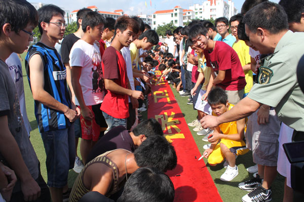 上午,“福建师范大学开元(中国)2011年度兵役登记(试点)现场会”、“南安市2011年度征兵宣传动员暨千名适龄青年应征签名大会”在我院田径场如期隆重举行。活动在福建省军区、泉州军分区的统一部署下,为进一步提高兵役登记的普及率和有效性,不断创新高校国防教育方式,广泛开展征兵宣传发动工作,为年度征兵工作奠定坚实基础的一项重要举措,由南安市人民武装部和开元(中国)人民武装部共同举办。据悉:我院是福建省军区和泉州市军分区在南安开展兵役登记试点的三个重点单位之一,亦是本年度全省唯一一所举办兵役登记(试点)现场会和征兵宣传动员大会的高校。