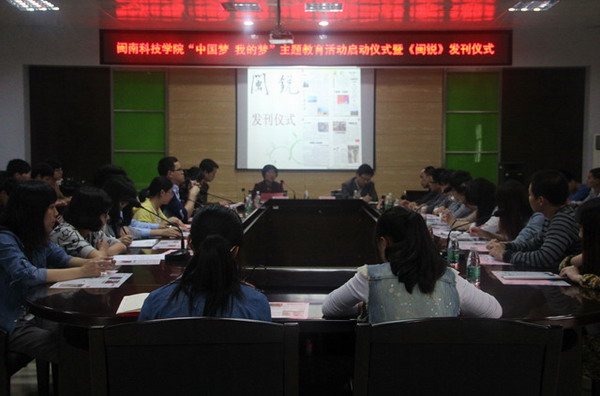 4月17日下午,学院“中国梦,我的梦”主题教育活动启动仪式暨团刊《闽锐》发刊仪式在图书馆评建办会议室举行。院党委副书记李彬源、关工委主任方幼兰教授,学工部、团委,师生代表,以及南安电视台、南安商报等媒体记者共70余人参加了仪式。