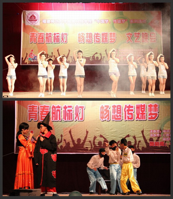 晚会上,报社和电台的学生载歌载舞,舞蹈秀《Time up》、脱口秀《闽科轶事联播》、英文剧《Forty Fortunes》、诗朗诵《梦在闽科》、服装秀《张扬青春》等倾情打造的节目,演绎了对青春、对传媒梦想的执着追求。晚会现场,高潮迭起,掌声欢呼声阵阵。晚会在所有演出人员合唱《爱因为在心中》中画上圆满句号。