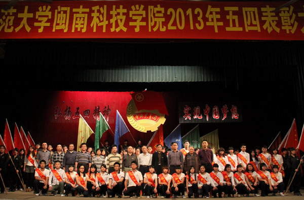 凝聚青春正能量,共筑伟大中国梦。5月4日下午,我院“弘扬五四精神 实现中国梦想”2013年五四表彰大会在学生活动中心隆重举行。大会现场团旗、院旗、系旗飘扬,汇成红色的海洋。大会号召全院青年学生继承和发扬伟大的五四精神,自觉自信地肩负起中华民族伟大复兴的神圣使命,珍惜时光,不懈进取,用青春、智慧和力量来追求并实现我们的“中国梦”。学院名誉院长陈兰荪,院领导邱永渠、林明旭、周勇军、李彬源、吴勇,学院各系部、中心负责老师,以及学生代表1000多人参加了大会。
