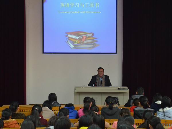 讲座上,吴建平教授介绍了英语学习的方法,他从英语语义信息的概念意义、文体意义、修辞及情感意义等方面强调了学习英语的重要性。吴建平教授还现场向同学们推荐了一些参考英语词典,并指导如何选用英语词典等。