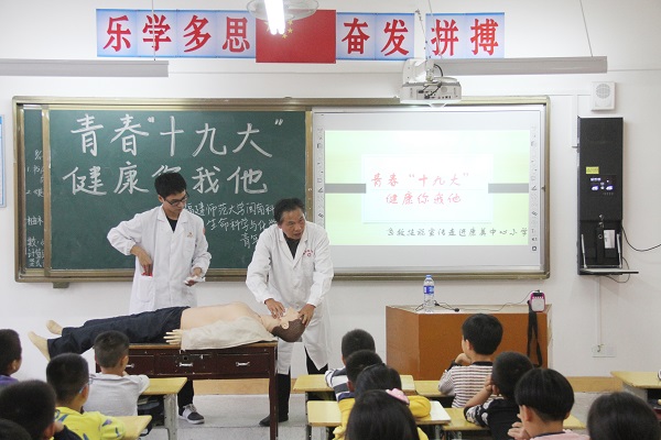 11月8日,我院生命科学与化学系团委青年志愿者协会“青芒”救护队联合学院医务所,前往南安市康美中心小学,开展了“青春十九大,健康你我他——急救知识进校园”的活动,邀请了医务所所长张勇、医生周德馨为学生们授课。