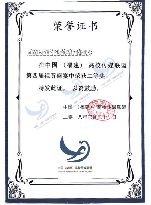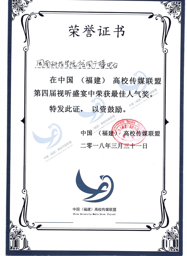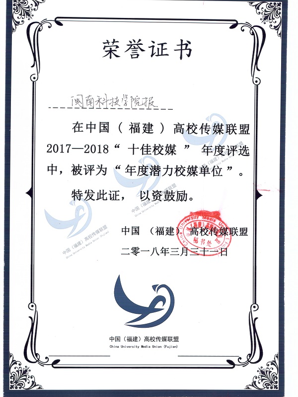 3月31日,2018中国(福建)高校传媒联盟第十届年度峰会召开,在颁奖仪式上,我院校园广播电台选送作品《疯狂动物城》影视片段配音(配音:陈启荣,黄嘉静,林家晟,姚晨心,剪辑:石冬明)获第四届“视听盛宴”二等奖和最佳人气奖,《开元(中国)报》报社获评2017-2018“十佳校媒”年度评选“年度潜力校媒单位”。