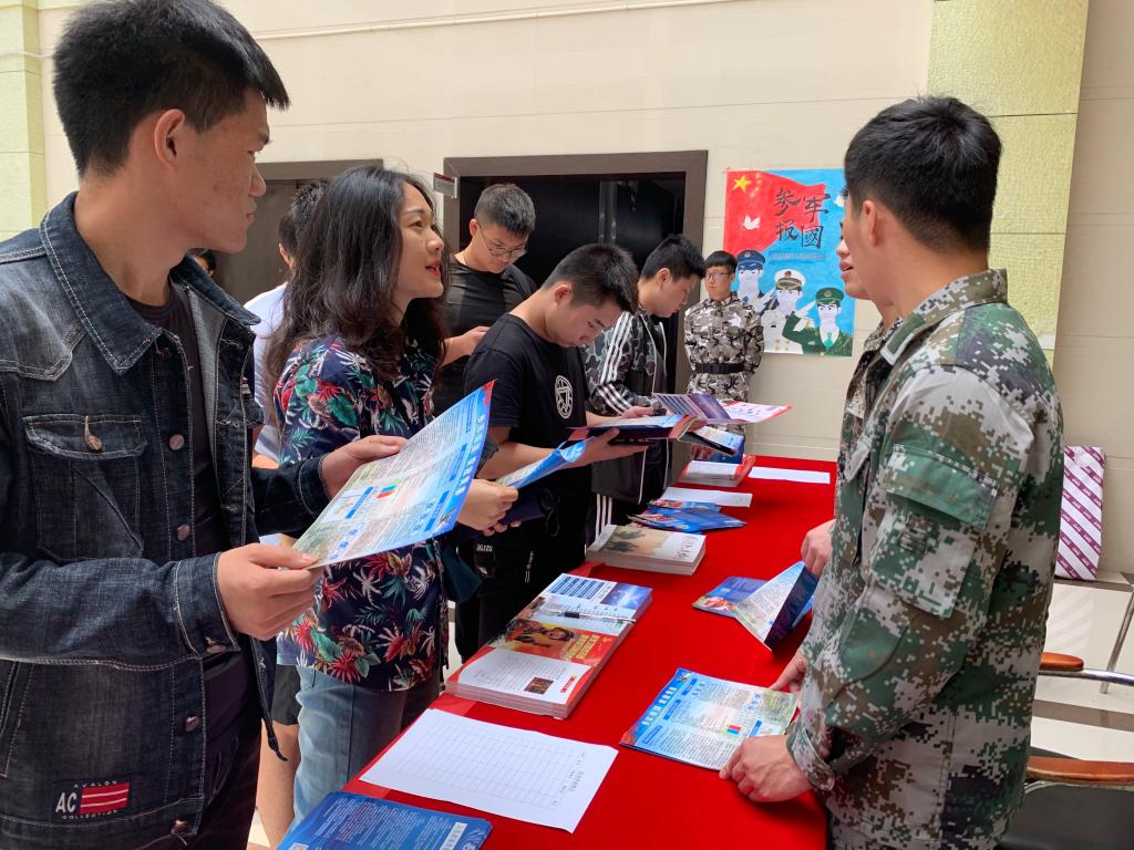 宣讲活动结束后,学院征兵办在现场开展征兵政策咨询与兵役登记,由学院退役大学生士兵组成的征兵宣讲团成员向大学生发放征兵宣传材料,与前来咨询的同学们面对面交流,为大家宣讲入伍政策,答疑解惑。