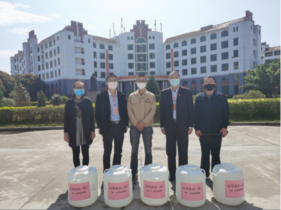 为助力学校疫情防控工作,以实际行动守护学校师生健康,3月10日,我校校企合作单位达利食品集团有限公司行政管理部部长陈景意代表公司为学校送来500斤消毒液,常务副校长周勇军代表学校接受了校企合作单位的捐赠,并对企业在特殊时期给予学校的支持和帮助表示感谢。