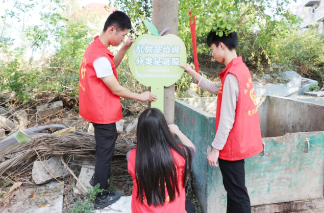 大学生青年志愿服务队在村里设置垃圾分类标语