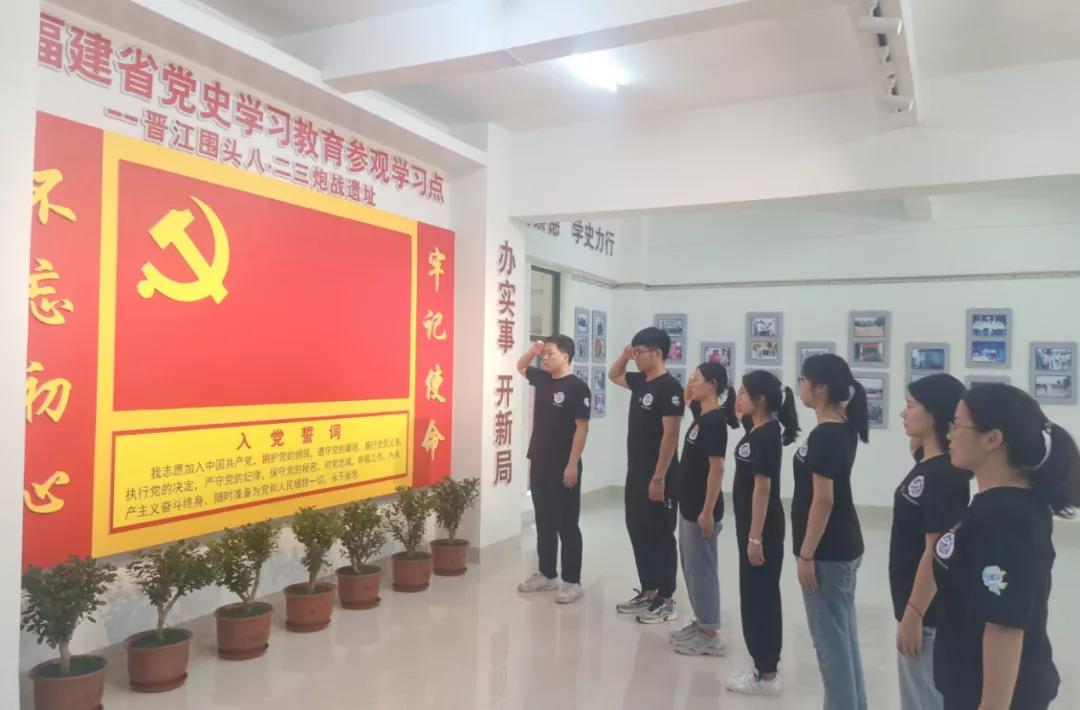 “1958年8月23日下午5点左右,福建前线部队同时打响金门炮战,围头成了战地最前沿……”来到省国防教育基地、省党史学习教育参观学习点——晋江市金井镇围头八二三战地公园,大家认真聆听炮战革命英雄事迹,瞻仰共产主义战士安业民雕像,参观了保护完整的地下坑道及地面战壕、碉堡、和平展馆、党建展示厅等,在往昔海峡烽火的见证中缅怀革命先烈,重温革命精神,接受爱国主义教育。在《战争与和平》展馆宣誓厅,实践队全体党员面向党旗,郑重举起右手,重温入党誓词。