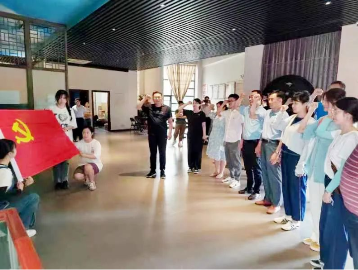 “我志愿加入中国共产党……”全体党员干部在党总支副书记(主持工作)陈章宫的带领下,面向党旗,高举右手,用铿锵有力的声音重温入党誓词。