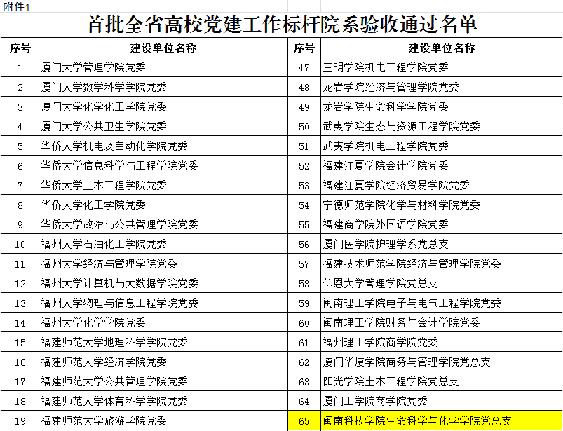 近日,中共福建省委教育工作委员会公布首批全省高校党建工作标杆院系、样板支部验收通过名单,我校生命科学与化学学院党总支通过“全省党建工作标杆院系”建设单位验收,计算机信息学院教师党支部、光电信息学院学生第一党支部、人文学院学生第三党支部、商学院学生第七党支部通过“全省党建工作样板支部”建设单位验收,已通过教育部验收的“全国党建工作样板支部”人文学院教师第一党支部视为通过省级验收。